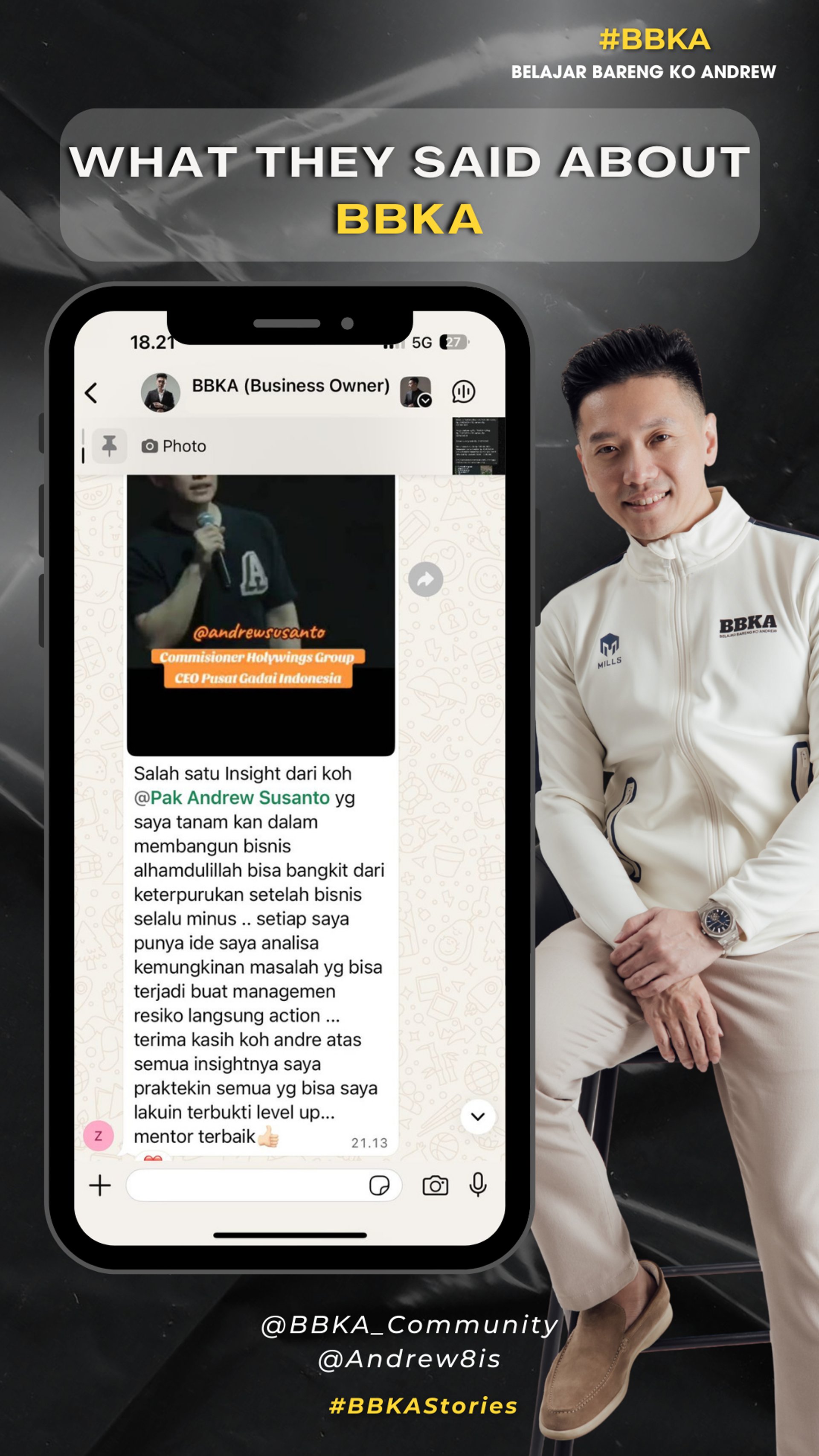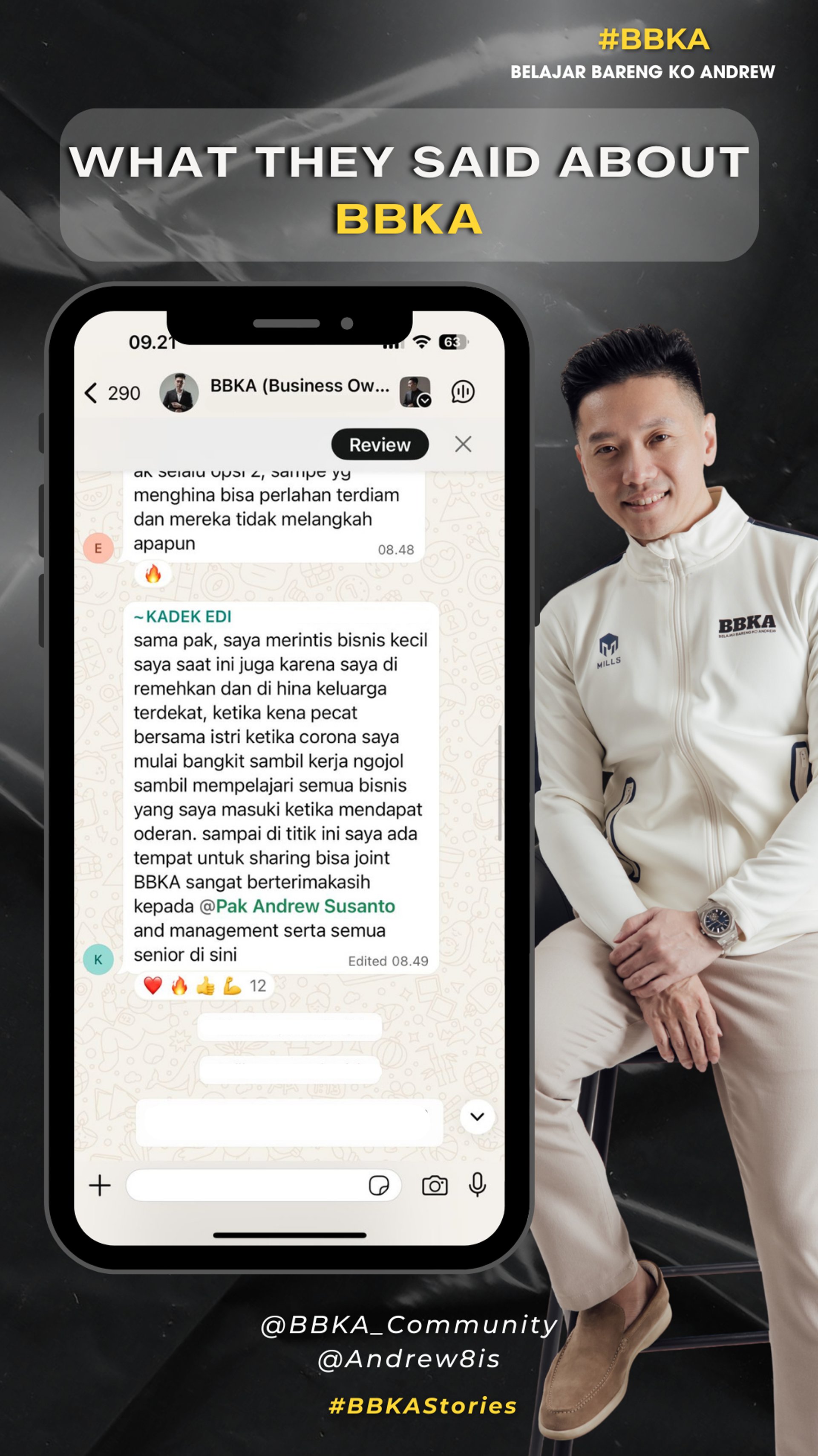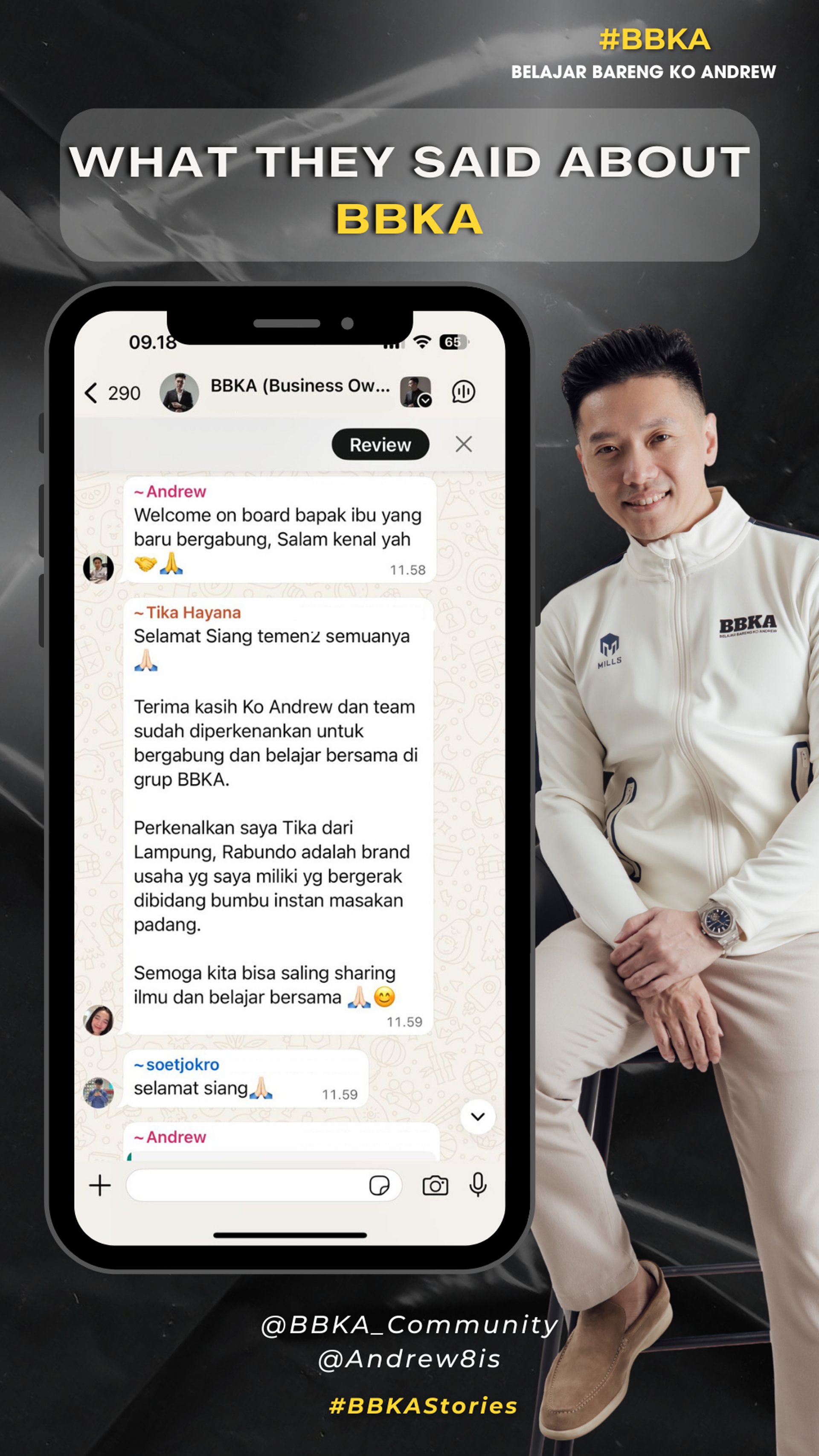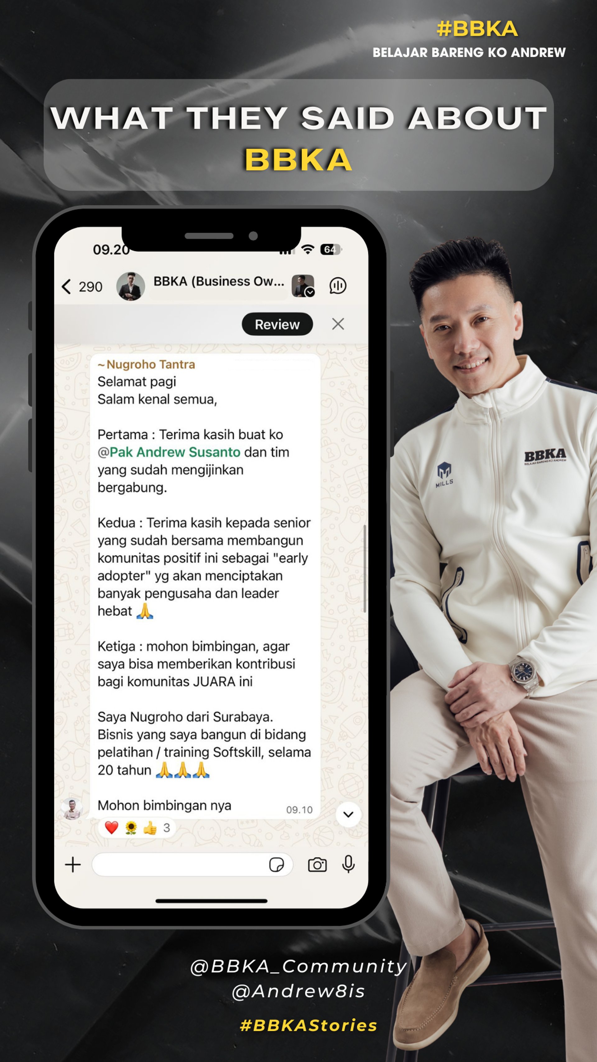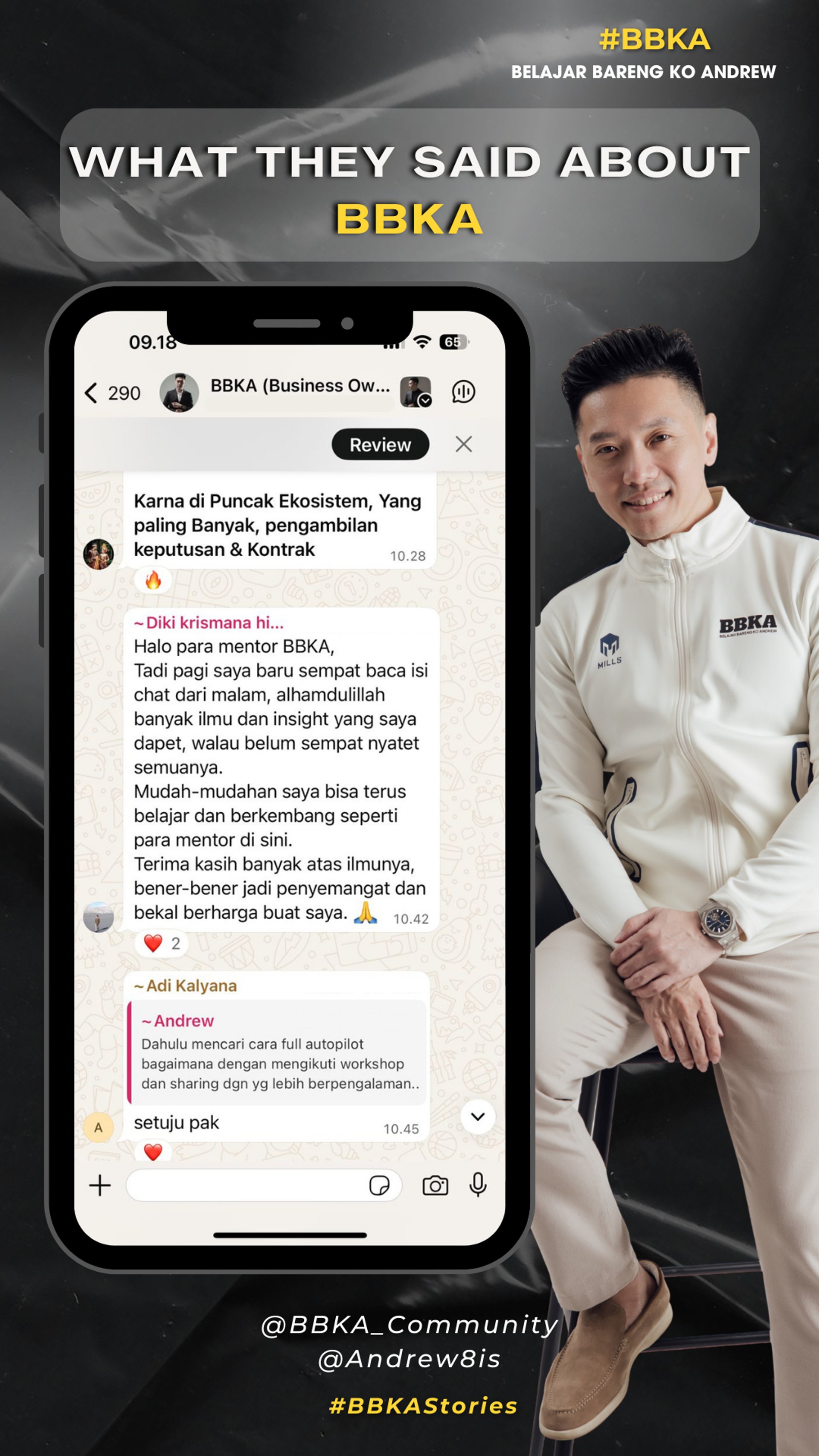 BBKA (Belajar Bareng Ko Andrew) lebih dari sebuah komunitas. Ini adalah gerakan untuk mendorong potensi wirausahawan muda. Temukan sumber daya, jalin hubungan dengan pemilik usaha, dan belajar langsung dari para praktisi seperti Andrew Susanto.