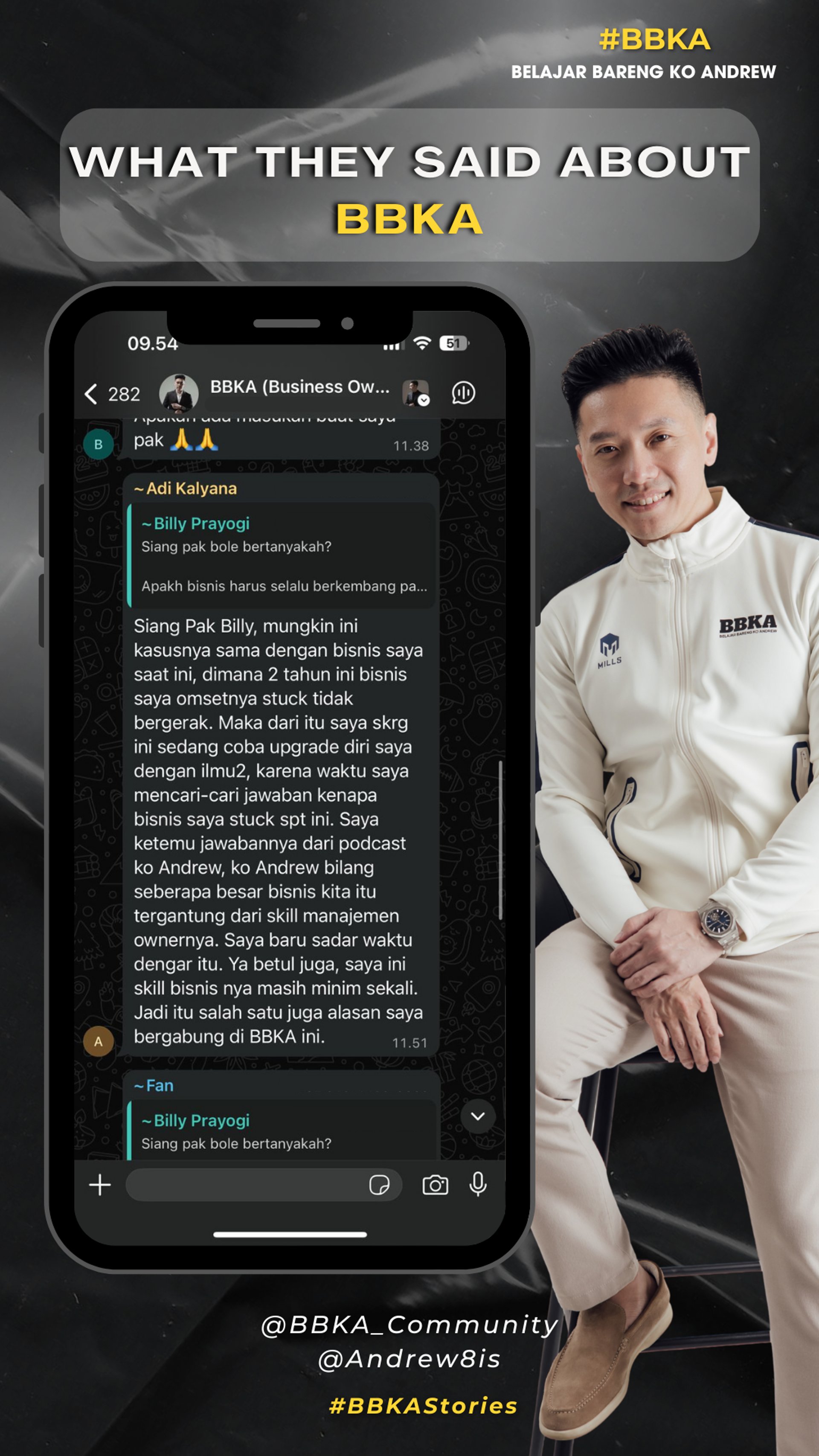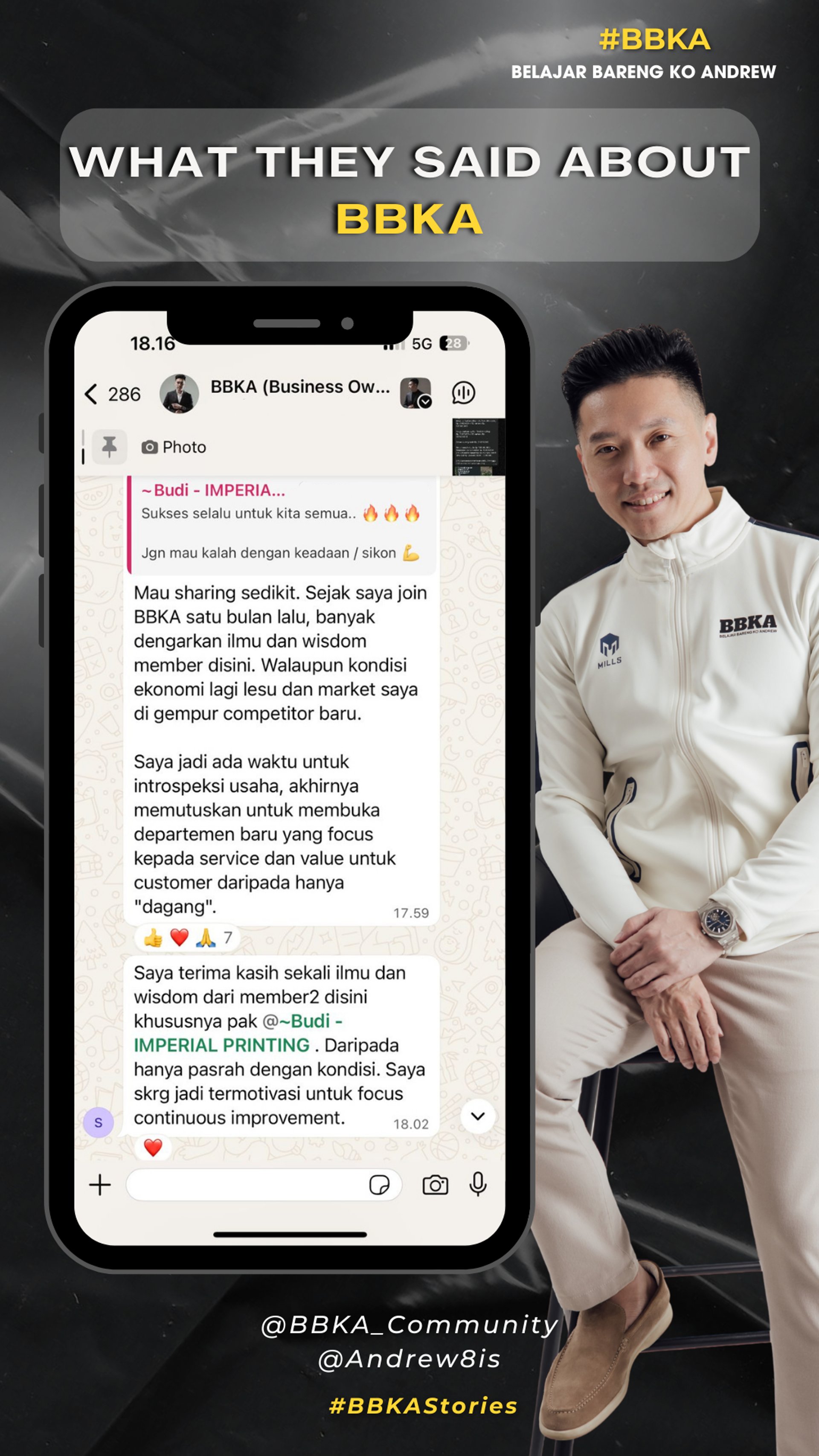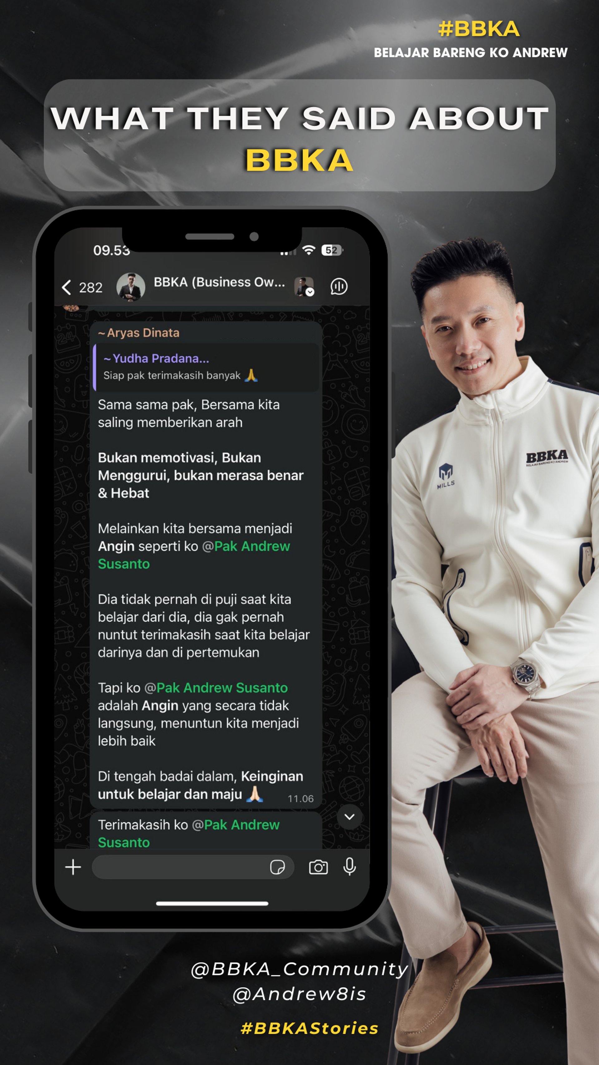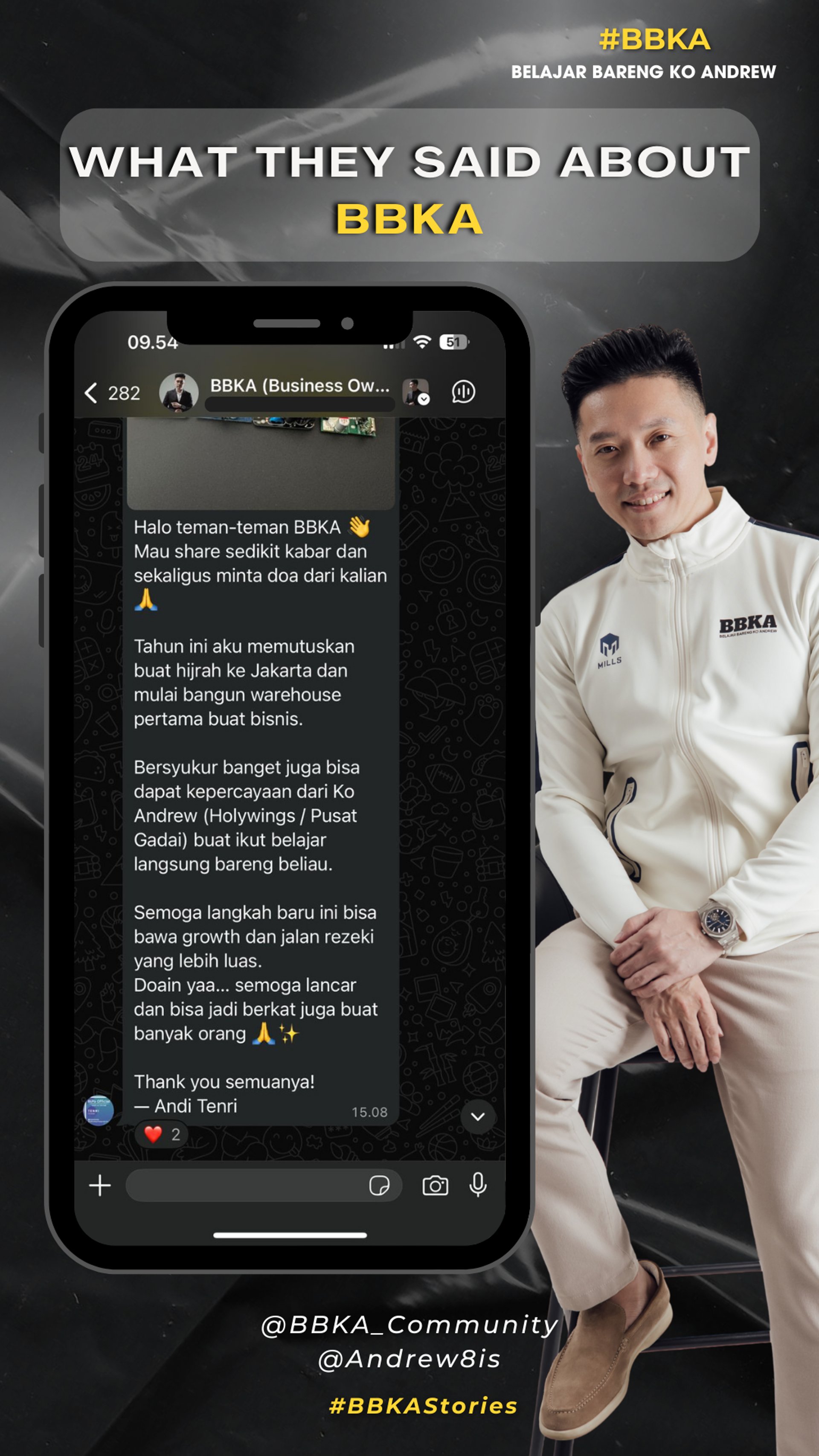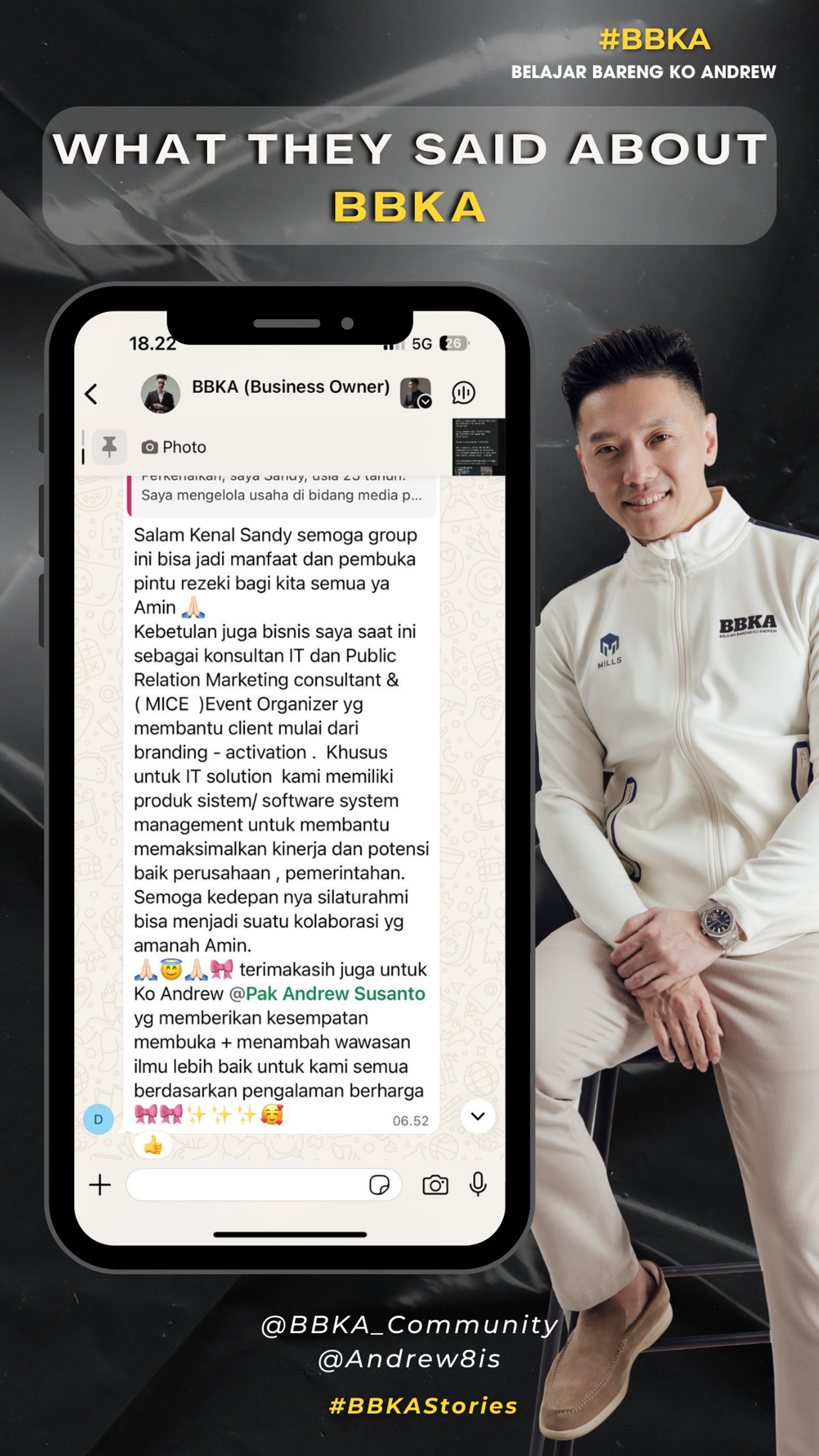 BBKA (Belajar Bareng Ko Andrew) lebih dari sebuah komunitas. Ini adalah gerakan untuk mendorong potensi wirausahawan muda. Temukan sumber daya, jalin hubungan dengan pemilik usaha, dan belajar langsung dari para praktisi seperti Andrew Susanto.